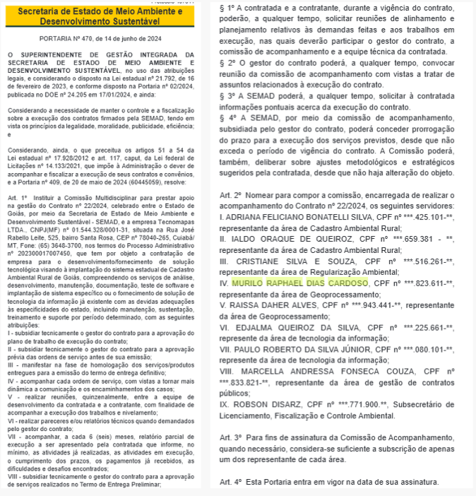 Publicação no Diário Oficial do Estado de Goiás com meu nome na Equipe do SIGCAR.